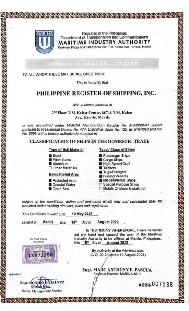 MARINA recognized PRS with the acceptance of the first Provisional Class Certificate issued to a vessel.